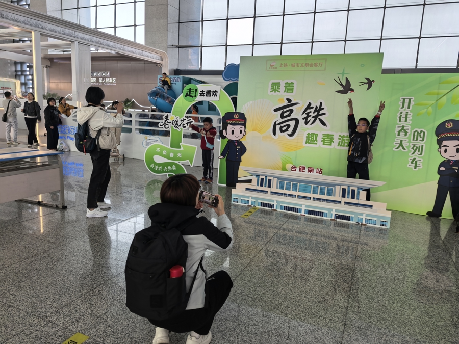 亲子搭客在合肥南站候车区“乘着高铁‘趣’春游”专属打卡点拍照眷恋 吴柳 摄