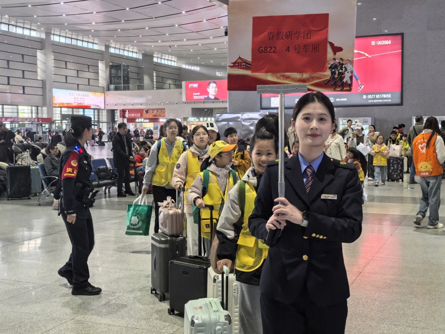 绍兴北站指派专东说念主率领研学团体有序候乘 杨亚琳 摄