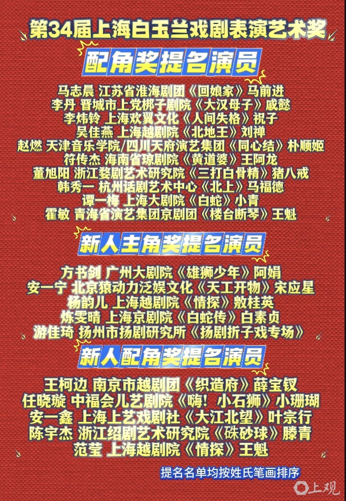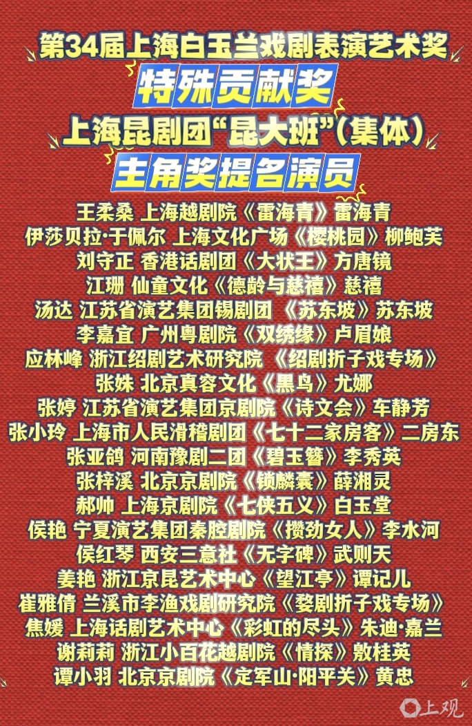 4月8日,第34届上海白玉兰戏剧饰演艺术奖公布特别孝顺奖获取者与主角奖、交集奖、新东谈主奖提名演员。