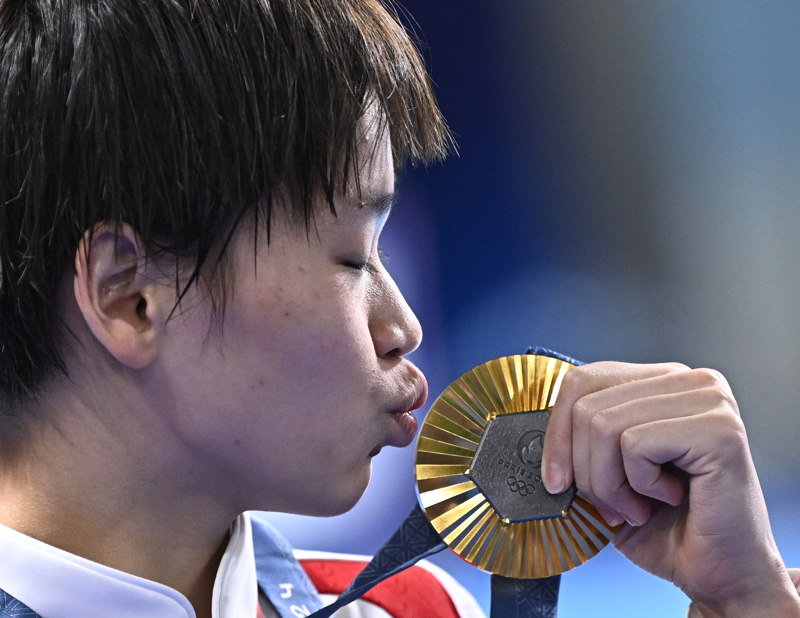 新华社相片,巴黎,2024年8月6日\n 8月6日,全红婵亲吻金牌。\n 当日,在巴黎奥运会跳水神志女子10米跳台决赛中,中国选手全红婵取得金牌,另又名中国选手陈芋汐取得银牌。\n 新华社记者 王鹏 摄