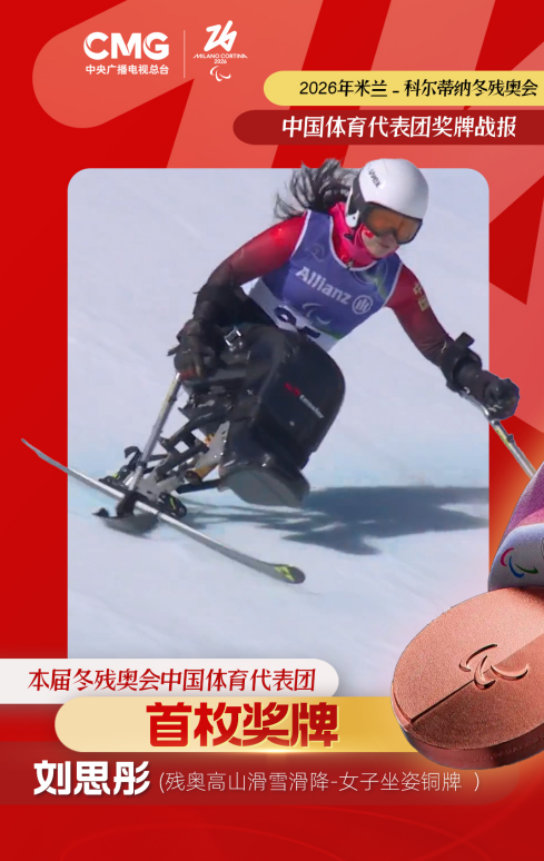 米兰-科尔蒂纳冬残奥会峻岭滑雪女子滑降(站姿)比赛,中国代表团开幕式旗头刘想彤夺得铜牌!这是本届赛事中国代表团首枚奖牌!